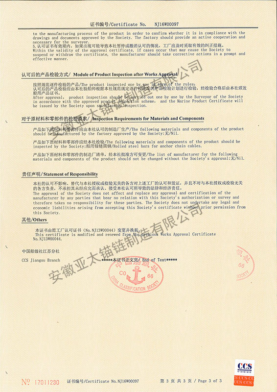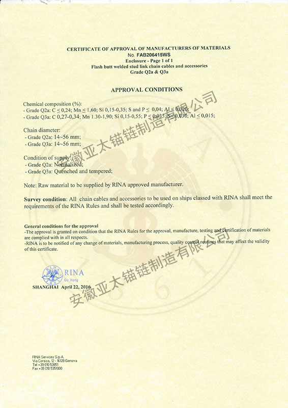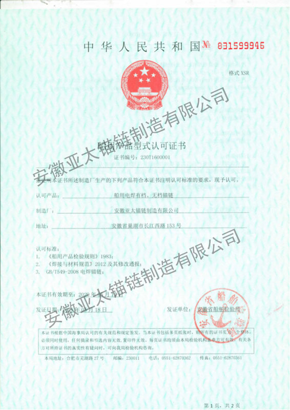 安徽亞太錨鏈制造有限公司是國家高新技術(shù)企業(yè),也是國家GB/T 549-2017《電焊錨鏈》標(biāo)準(zhǔn)的起草和制定單位之一。公司旗下設(shè)有錨鏈分廠、浮標(biāo)分廠、舾裝件分廠等多個(gè)分廠。公司專業(yè)從事φ12.5mm-φ107mm二、三級船用錨鏈、浮標(biāo)錨鏈、錨鏈附件,錨、船舶曬裝產(chǎn)品、航標(biāo)、系船浮、船型標(biāo)、多種規(guī)格海洋監(jiān)測浮標(biāo)及航標(biāo)燈等產(chǎn)品的生產(chǎn)、安裝和服務(wù)。目前公司的產(chǎn)品銷往全國各地船廠、碼頭、航標(biāo)處、航道局、海洋局,并已走上國際市場,如東南亞、中東、歐美等國家。